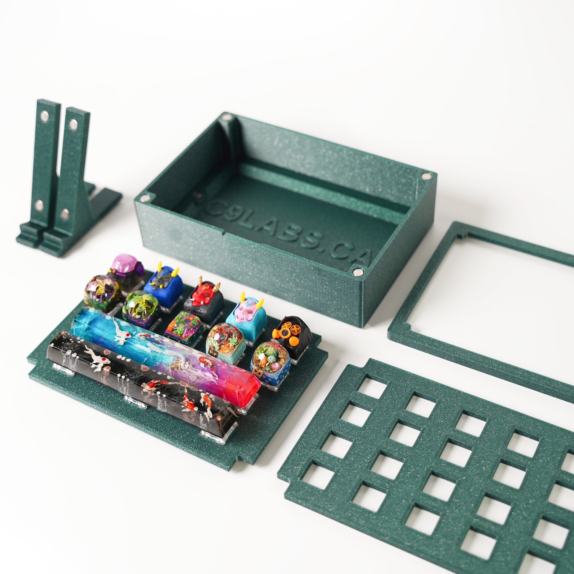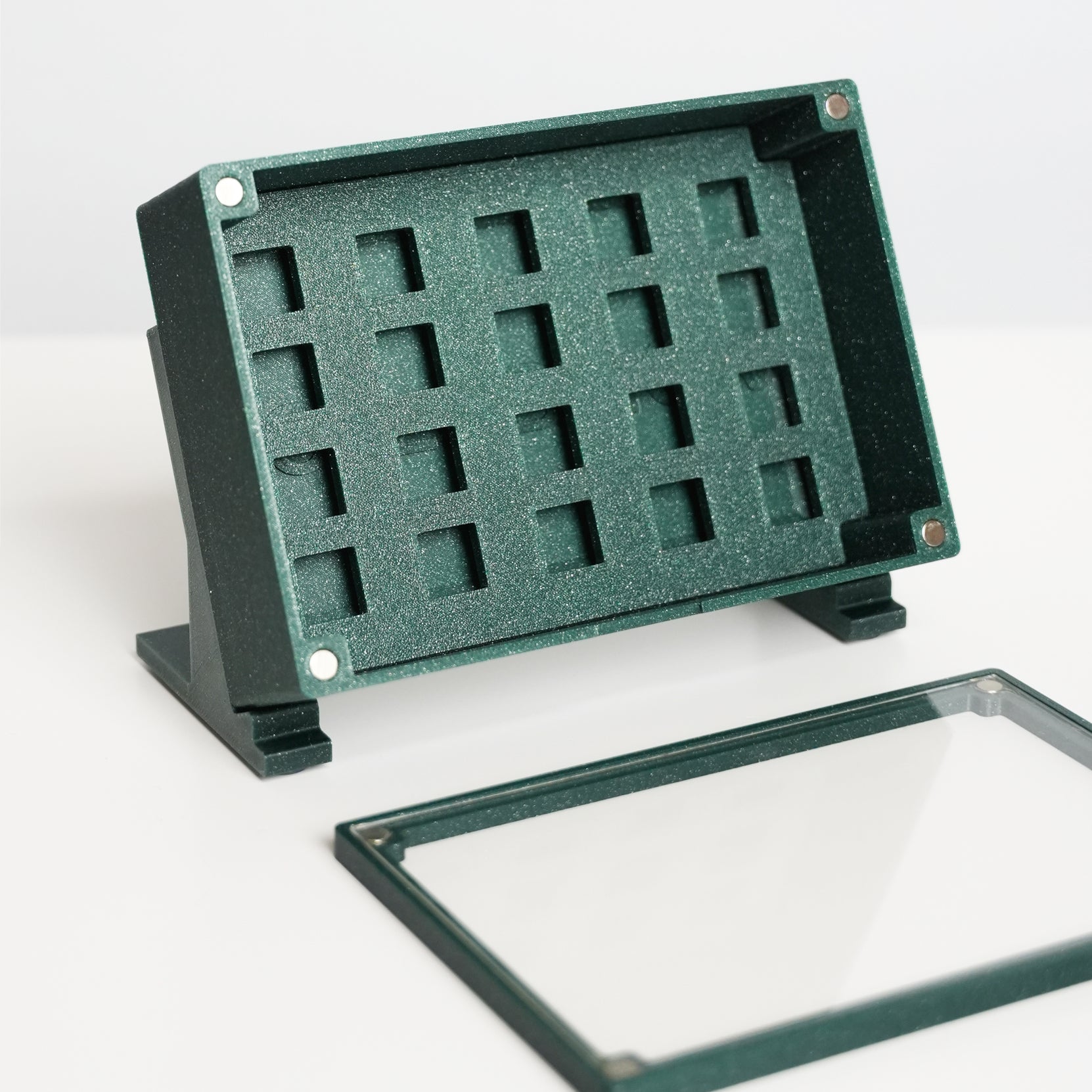 Keycap box has magnets all around it to securly hold in place the keycap plate, and the top glass. The feet are magnetic as well if you wish to display your keycaps vertically you can.